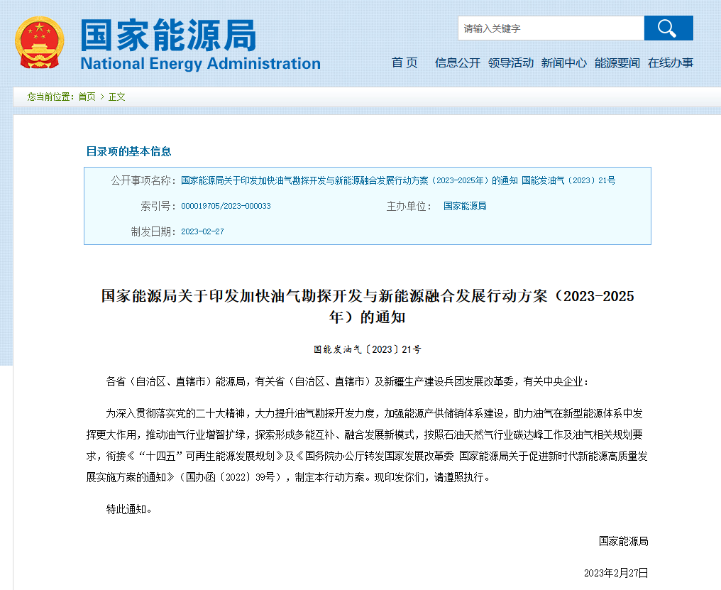 國家能源局3月22日公布關(guān)于印發(fā)加快油氣勘探開發(fā)與新能源融合發(fā)展行動方案(2023-2025年)的通知。其中提到,加快提升油氣上游新能源存儲消納能力。