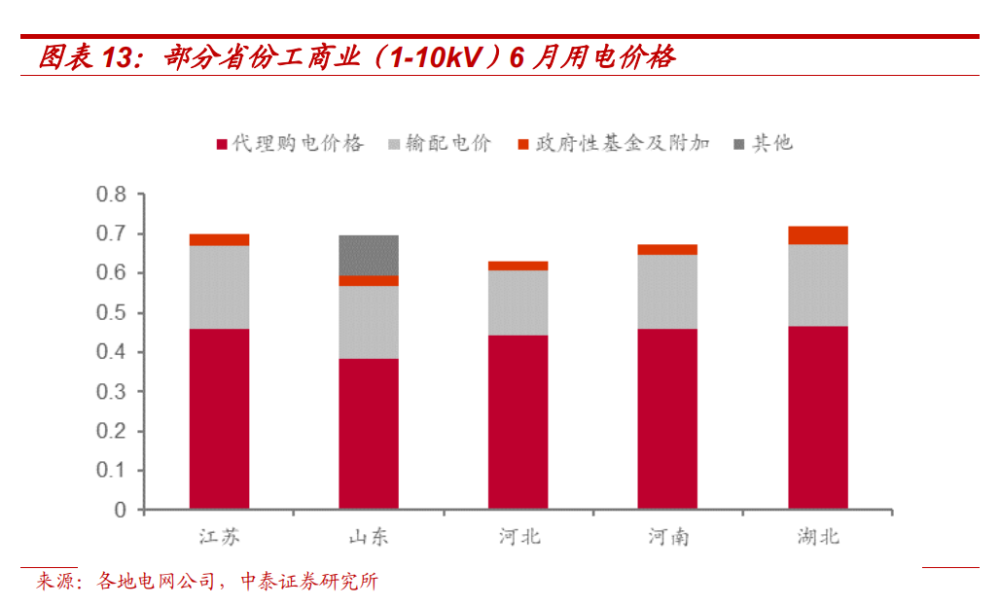 此前,關(guān)于儲(chǔ)能充電是否需承擔(dān)輸配電價(jià)等費(fèi)用,各地沒有明確統(tǒng)一的標(biāo)準(zhǔn)?!锻ㄖ诽貏e指出,獨(dú)立儲(chǔ)能電站向電網(wǎng)送電的,其相應(yīng)充電電量不承擔(dān)輸配電價(jià)和政府性基金及附加,這一規(guī)定將大幅降低儲(chǔ)能充電成本。我們統(tǒng)計(jì)了部分省份2022年6月代理購(gòu)電的用電價(jià)格,輸配電價(jià)和政府性基金及附加合計(jì)占用電價(jià)格的比例超過30%,以江蘇省為例,代理購(gòu)電價(jià)格、輸配電價(jià)、政府性基金及附加分別為0.4594、0.2110、0.0294 元/kWh,輸配電價(jià)及政府性基金占用電價(jià)格比例為 34.35%。若儲(chǔ)能充電需支付這兩部分費(fèi)用,將大幅提高充電成本,因此這一規(guī)定將明確儲(chǔ)能項(xiàng)目邊界條件,保障儲(chǔ)能合理收益,提高儲(chǔ)能投資意愿。