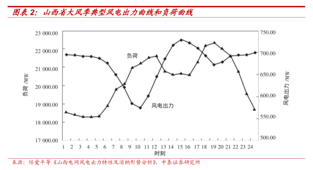根據(jù)山西省大風(fēng)季典型風(fēng)電出力曲線和負(fù)荷曲線可見,風(fēng)電出力和負(fù)荷二者具有較大差異,風(fēng)電在21時(shí)至次日5時(shí)出力處于相對(duì)高位,而此時(shí)用電負(fù)荷卻