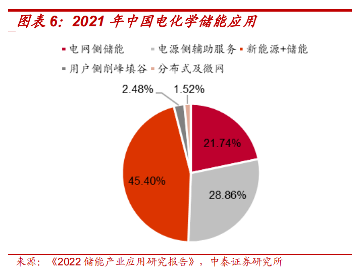 2021年起,各省密集發(fā)布新能源項(xiàng)目配套儲(chǔ)能政策,配臵比例主要在 10%-20%區(qū)間,配臵時(shí)長(zhǎng)1-2小時(shí),推動(dòng)我國(guó)電化學(xué)儲(chǔ)能高速增長(zhǎng)。根據(jù)《2022儲(chǔ)能產(chǎn)業(yè)研究報(bào)告》,2021年我國(guó)新能源配儲(chǔ)占電化學(xué)儲(chǔ)能應(yīng)用的45.40%,我國(guó)電化學(xué)儲(chǔ)能主要應(yīng)用在電源側(cè)和電網(wǎng)側(cè)來支持風(fēng)光新能源消納和新型電力系統(tǒng)建設(shè)。