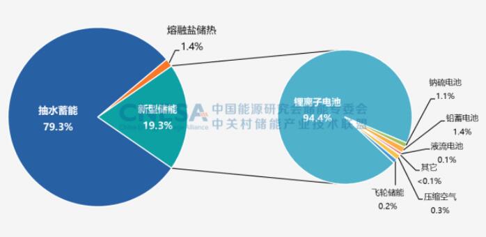 2022年,中國(guó)新增投運(yùn)電力儲(chǔ)能項(xiàng)目裝機(jī)規(guī)模首次突破15GW,達(dá)到16.5GW,其中,抽水蓄能新增規(guī)模9.1GW,同比增長(zhǎng)75%;新型儲(chǔ)能新增規(guī)模創(chuàng)歷史新高,達(dá)到7.3GW/15.9GWh,功率規(guī)模同比增長(zhǎng)200%,能量規(guī)模同比增長(zhǎng)280%;新型儲(chǔ)能中,鋰離子電池占據(jù)絕對(duì)主導(dǎo)地位,比重達(dá)97%,此外,壓縮空氣儲(chǔ)能、液流電池、鈉離子電池、飛輪等其它技術(shù)路線的項(xiàng)目,在規(guī)模上有所突破,應(yīng)用模式逐漸增多。