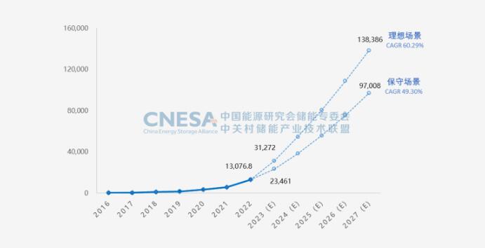 CNESA自2014年起對(duì)中國(guó)儲(chǔ)能市場(chǎng)規(guī)模進(jìn)行預(yù)測(cè),本版白皮書中,CNESA基于保守場(chǎng)景(定義為政策執(zhí)行、成本下降、技術(shù)改進(jìn)等因素未達(dá)預(yù)期的情形)和理想場(chǎng)景(定義為各省儲(chǔ)能規(guī)劃目標(biāo)順利實(shí)現(xiàn)的情形)對(duì)2023-2027年中國(guó)新型儲(chǔ)能市場(chǎng)的規(guī)模和發(fā)展趨勢(shì)進(jìn)行預(yù)測(cè)。