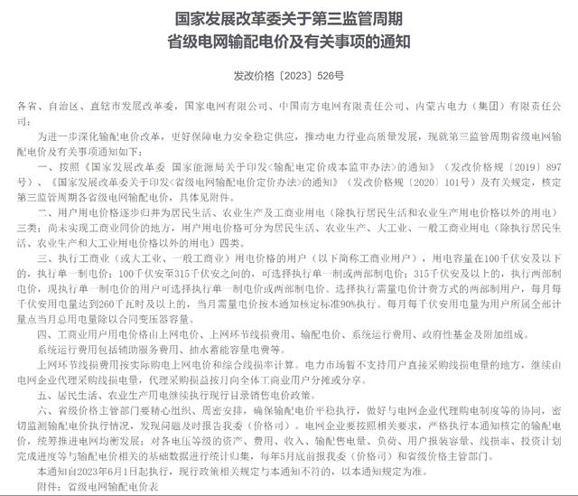 5月15日,國(guó)家發(fā)改委官網(wǎng)發(fā)布《關(guān)于第三監(jiān)管周期省級(jí)電網(wǎng)輸配電價(jià)及有關(guān)事項(xiàng)的通知》(發(fā)改價(jià)格〔2023〕526號(hào))、《關(guān)于第三監(jiān)管周期區(qū)域電網(wǎng)輸電價(jià)格及有關(guān)事項(xiàng)的通知》(發(fā)改價(jià)格〔2023〕532號(hào))關(guān)于輸配電價(jià)的重要文件。本次文件在2015年電力市場(chǎng)化改革后可以視為里程碑式的文件。