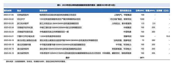 其中,釩電池儲(chǔ)能在政策驅(qū)動(dòng)和技術(shù)不斷成熟的加持下,市場(chǎng)滲透率有望進(jìn)一步提升。據(jù)不完全統(tǒng)計(jì),截至2023年5月第三周,國(guó)內(nèi)已簽約釩液流儲(chǔ)能項(xiàng)目10個(gè),合計(jì)裝機(jī)功率達(dá)2.9GW,是2022年已投運(yùn)釩電池儲(chǔ)能裝機(jī)規(guī)模的近15倍。