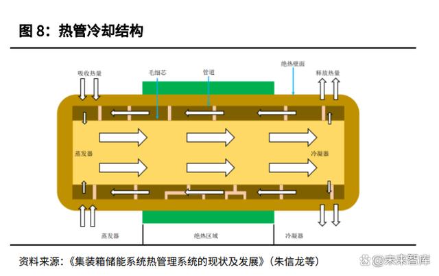 相變材料和熱管冷卻仍處于在研階段,成本和穩(wěn)定性是影響其投產(chǎn)的重要原 因。相變材料冷卻是使電池單體直接接觸相變材料,利用其相變過(guò)程吸收熱 量實(shí)現(xiàn)對(duì)鋰離子電池的冷卻。相變材料冷卻可以明顯提升儲(chǔ)能系統(tǒng)溫度分布 的均勻性,但其價(jià)格較高,且當(dāng)相變材料吸熱時(shí),其體積變化明顯,容易對(duì) 儲(chǔ)能系統(tǒng)的工作性能產(chǎn)生影響。熱管是一種利用介質(zhì)在吸熱端的蒸發(fā)帶走熱 量,再在放熱端通過(guò)冷凝的方式將熱量傳遞到外界的裝置,這一冷卻技術(shù)已 相對(duì)成熟,但其成本較高,在手機(jī)等電子設(shè)備上使用較多,應(yīng)用于儲(chǔ)能系統(tǒng) 上性價(jià)比低。