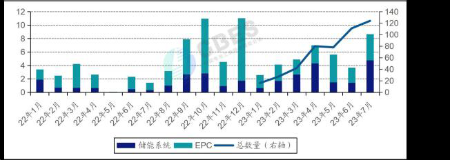 中標(biāo)數(shù)據(jù)顯示逐步回暖。7月共統(tǒng)計到儲能中標(biāo)項目124個,總規(guī)模達(dá)8.7GWh ,環(huán)比增長136% ,同比增長499% ,其中儲能EPC項目共計77個,規(guī)模3.9GWh ,儲能系統(tǒng)項目共計47個,規(guī)模為4.8GWh。