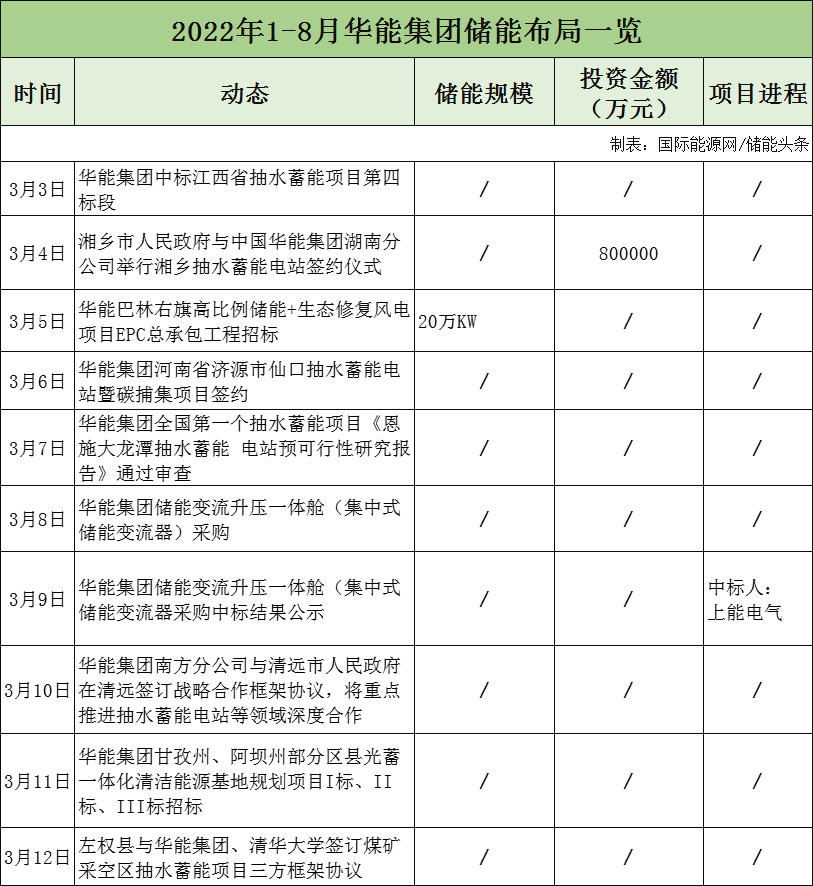 2022年,華電集團成立新能源公司從事儲能技術(shù)服務等業(yè)務,并開啟磷酸鐵鋰電化學儲能系統(tǒng)集采。儲能項目招標6個,均為抽水蓄能項目。