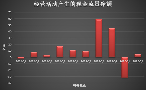 好在二季度,隨著鋰價(jià)在30萬(wàn)元/噸企穩(wěn),中下游廠商在一季度過(guò)度去庫(kù)存以后,二季度的采購(gòu)也有所回調(diào),贛鋒鋰業(yè)的經(jīng)營(yíng)活動(dòng)現(xiàn)金流因此也有所回暖,重新回歸正數(shù)達(dá)到4.78億元,但是相較去年同期的高景氣水平依舊有較大差距。