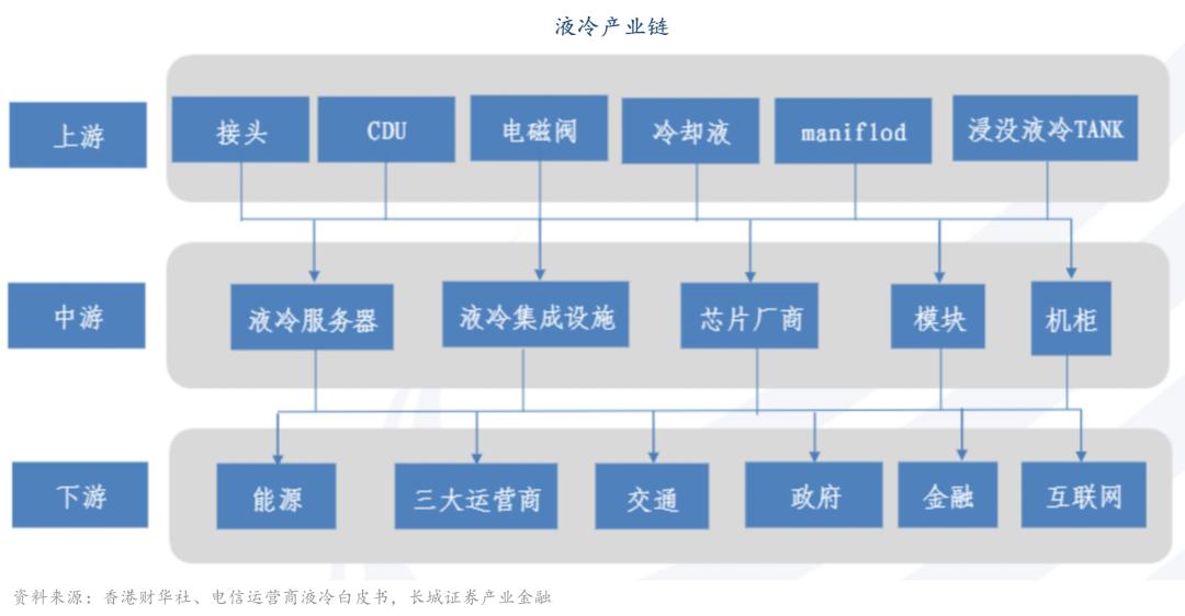 相比于風(fēng)冷技術(shù),液冷具有更高的冷卻效率和成長性。根據(jù)中國證券報(bào)研究,產(chǎn)品零部件提供商、液冷服務(wù)器提供商及算力使用者貫穿整個液冷產(chǎn)業(yè)生態(tài)的上、中、下游。我國液冷技術(shù)起步稍晚于國外,但起步后發(fā)展迅速,后期與國外發(fā)展進(jìn)程基本同步,并且在液冷規(guī)模試點(diǎn)應(yīng)用方面積累了豐富經(jīng)驗(yàn)。