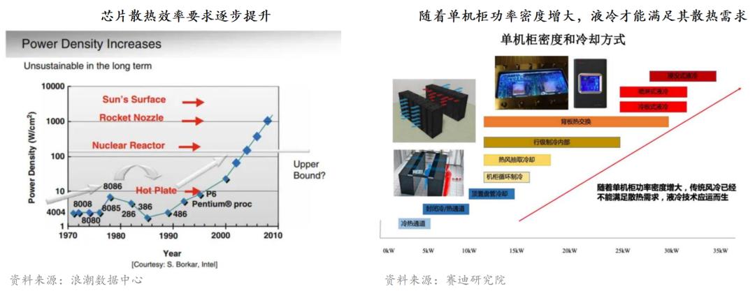 AI等新的應(yīng)用場景出現(xiàn),對算力設(shè)備和承載算力的數(shù)據(jù)中心均提出更高的要求。在拉動數(shù)據(jù)中心的需求的同時,伴隨著算力密度的提高,算力設(shè)備、數(shù)據(jù)中心機(jī)柜的熱密度都將顯著提高,液冷技術(shù)在數(shù)據(jù)中心散熱和算力設(shè)備散熱的全鏈條導(dǎo)入將加快。