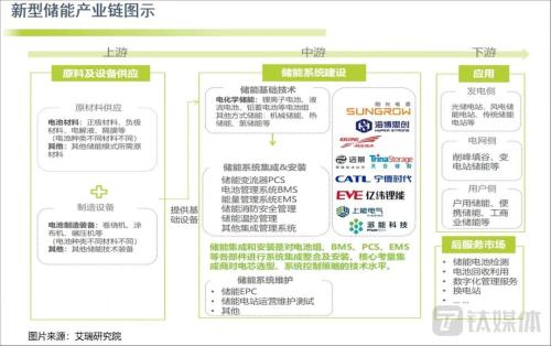根據(jù)艾瑞研究院的梳理,儲(chǔ)能產(chǎn)業(yè)鏈的上游主要是電池材料的原材料供應(yīng)商和制造商;中游則是系統(tǒng)建設(shè)環(huán)節(jié),包括基礎(chǔ)技術(shù)、系統(tǒng)集成安裝和系統(tǒng)運(yùn)維三大部分,市場(chǎng)中最知名的寧德時(shí)代、億鋰緯能、陽(yáng)光電源、天合光能等都處于中游;下游則是發(fā)電側(cè)、電網(wǎng)側(cè)、用戶(hù)側(cè)的應(yīng)用及服務(wù)。