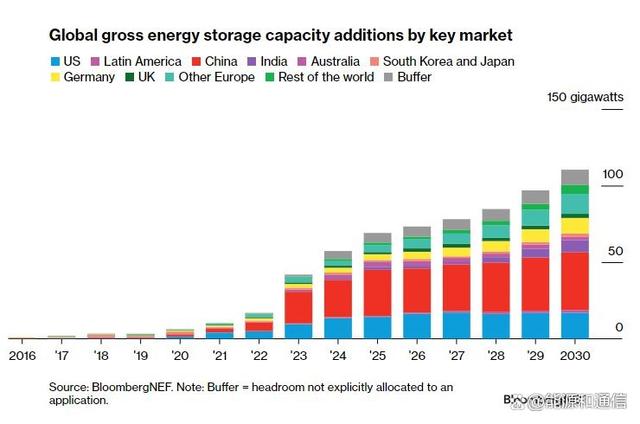 BloombergNEF對全球主要地區(qū)到2030年底的安裝量預(yù)測。