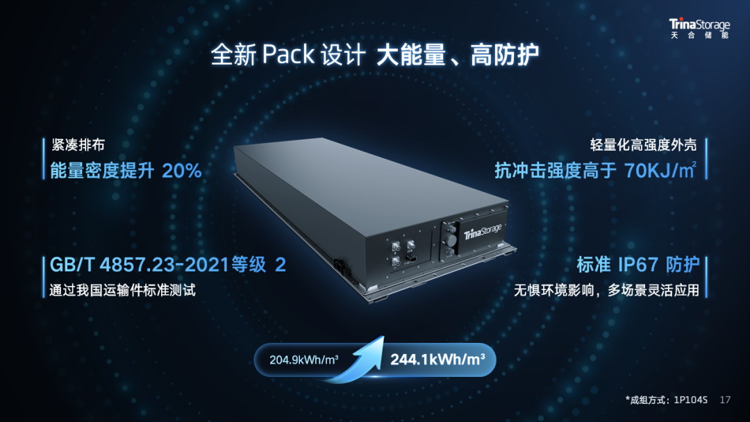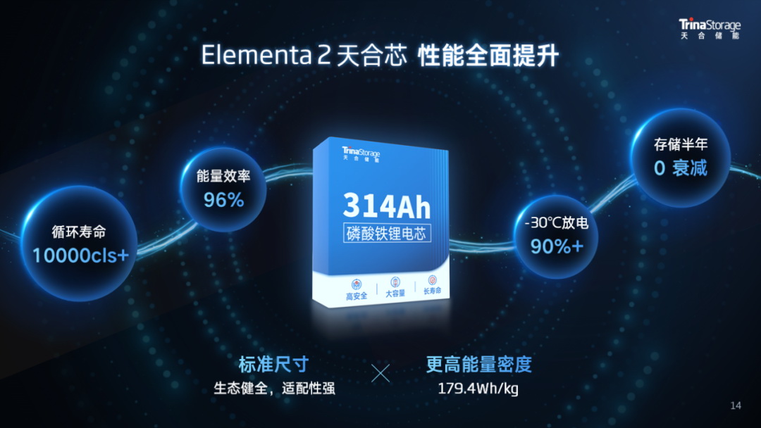 通過(guò)優(yōu)化電芯結(jié)構(gòu)和智造工藝,天合自研高安全、高能量密度的314Ah儲(chǔ)能專用電芯,循環(huán)壽命可達(dá)10000cls+,能量密度179.4Wh/kg,能量效率高達(dá)96%,同時(shí)采用主流標(biāo)準(zhǔn)的71173尺寸,完美適配當(dāng)前主流系統(tǒng)集成方案,實(shí)現(xiàn)同尺寸下系統(tǒng)能量的顯著提升。
