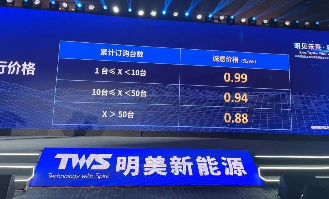 工商業(yè)領(lǐng)域的最低報價為0.88元/Wh,來自明美新能源,液冷系統(tǒng)。去年12月8日,在其舉辦的工商業(yè)儲能新品發(fā)布會暨戰(zhàn)略合作伙伴發(fā)展大會上,官宣了這一價格。