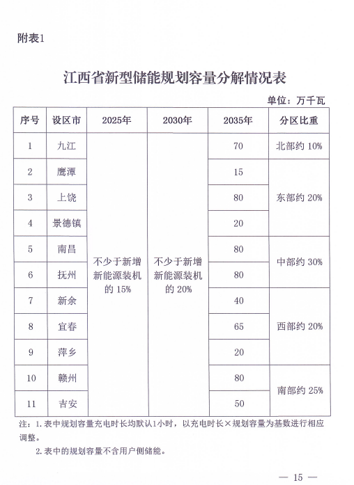 《發(fā)展規(guī)劃》制定了江西省分階段的儲(chǔ)能發(fā)展目標(biāo):到2025年、2030年,力爭(zhēng)實(shí)現(xiàn)各設(shè)區(qū)市新型儲(chǔ)能投產(chǎn)規(guī)模不少于新增新能源裝機(jī)的15%和20%。到2035年,力爭(zhēng)實(shí)現(xiàn)全省新型儲(chǔ)能投產(chǎn)600萬(wàn)千瓦以上。