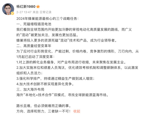 在這條微博中,楊紅新指出了2024年蜂巢能源最核心的三個戰(zhàn)略任務,除了上述“高質量經營變革”的任務,還包括死磕增程插混電池、加大海外布局兩項。