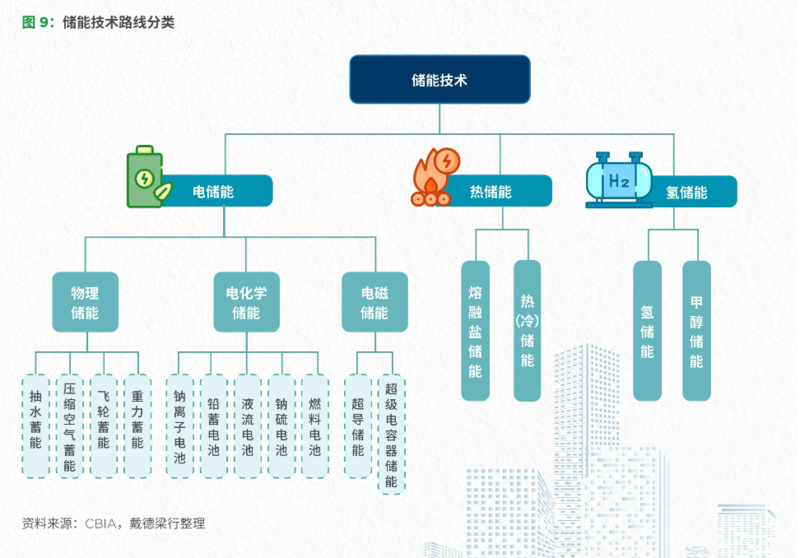 儲(chǔ)能,是指通過(guò)不同方式、利用特定的裝置或物理介質(zhì),將不同形式的能量?jī)?chǔ)存起來(lái),以便在需要時(shí)利用的技術(shù)。根據(jù)技術(shù)路徑不同,儲(chǔ)能形式主要分為電儲(chǔ)能、熱儲(chǔ)能和氫儲(chǔ)能三大類,其中電化學(xué)與物理儲(chǔ)能為現(xiàn)階段主要技術(shù)路線。儲(chǔ)能系統(tǒng)是新型電力系統(tǒng)有效的調(diào)峰調(diào)頻、平滑波動(dòng)手段及重要的備用資源,大力發(fā)展儲(chǔ)能對(duì)提高光伏、風(fēng)電等可再生能源利用率,實(shí)現(xiàn)“雙碳”目標(biāo)具有重要意義。