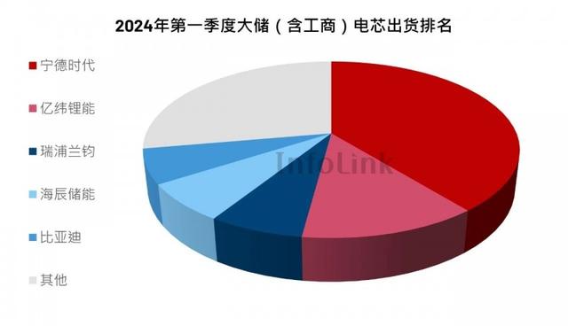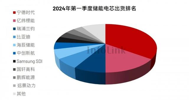 有所不同的是,參照2023年,今年Q1頭部企業(yè)格局發(fā)生改變:除了寧德時代市占率領(lǐng)先穩(wěn)坐龍頭、海辰儲能仍舊第五的位置不變之外,比亞迪從第二退居第四,億緯鋰能憑借大額訂單的儲能電池出貨量同比增長翻倍,升至第二,瑞浦蘭鈞則延續(xù)去年的出貨勢頭上升一個名次,位居第三。