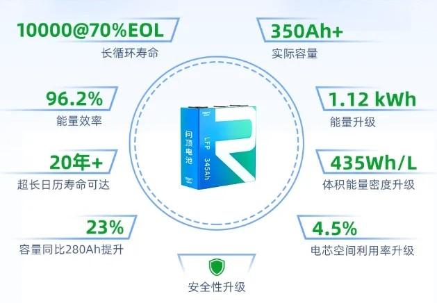 再加上融合電化學(xué)固液界面技術(shù)等多項創(chuàng)新技術(shù),使得電芯內(nèi)部空間的利用效率得到進一步提升。以問頂345Ah儲能電芯為例,實際容量超350Ah,能量升級至1.12 kWh,體積能量密度升級至440Wh/L,能量效率達96.2%,可減少能量轉(zhuǎn)換損耗降低7%成本,相當(dāng)于又一次升級了大儲產(chǎn)品力。