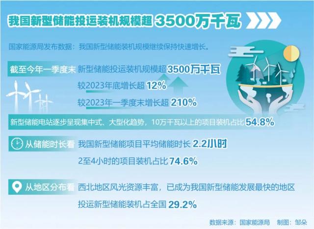 國家能源局發(fā)布數(shù)據(jù):我國新型儲能裝機規(guī)模繼續(xù)保持快速增長。截至今年一季度末,新型儲能投運裝機規(guī)模超3500萬千瓦,較2023年底增長超12%,較2023年一季度末增長超210%。