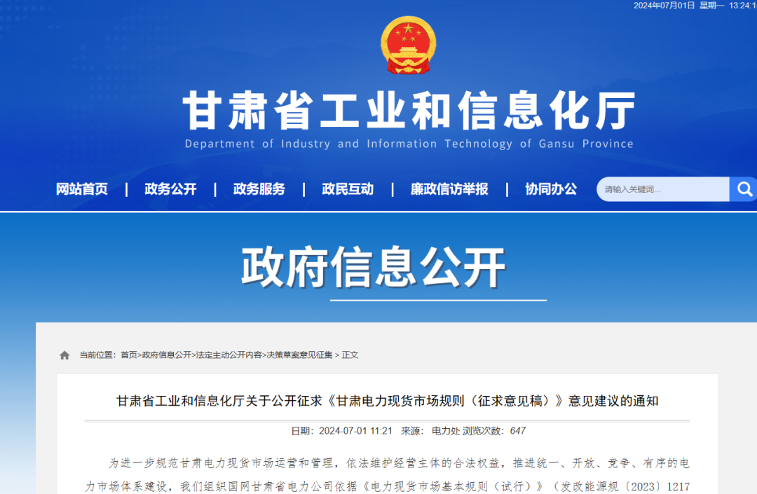 甘肅省工業(yè)和信息化廳關(guān)于公開(kāi)征求《甘肅電力現(xiàn)貨市場(chǎng)規(guī)則(征求意見(jiàn)稿)》意見(jiàn)建議的通知
