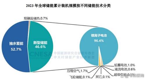 據(jù)CNESA統(tǒng)計,截至2023年底全球新型儲能市場累計裝機規(guī)模約為91.326GW,較上一年末增長99.6%,其中鋰離子電池儲能市場份額96.9%,占據(jù)絕對主導地位。
