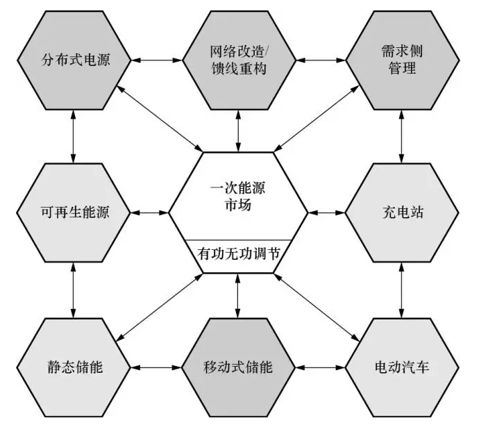 為了輔助智能電網(wǎng)規(guī)劃人員確保系統(tǒng)運(yùn)行的安全性,可靠性以及供電質(zhì)量,需要開發(fā)綜合全面的新工具。文獻(xiàn)[16]通過(guò)對(duì)智能技術(shù)及其交互方式進(jìn)行分類,設(shè)計(jì)了一個(gè)專為智能電網(wǎng)規(guī)劃人員量身定做的工具箱架構(gòu)(如圖5所示)。規(guī)劃人員在確定電網(wǎng)建設(shè)和饋線重構(gòu)方案時(shí),并非像傳統(tǒng)做法那樣只考慮峰荷,而是同時(shí)考慮分布式電源(DG)、移動(dòng)式存儲(chǔ)和需求側(cè)管理(DSM),這樣得到的方案更具成本效益。通過(guò)可再生能源和靜態(tài)儲(chǔ)能相互配合可以削峰填谷,增加網(wǎng)絡(luò)容量;充電站的電動(dòng)汽車耗電量受實(shí)時(shí)電價(jià)變化的影響,因此可作為DSM的一部分;各類儲(chǔ)能設(shè)備可被用來(lái)提升電能質(zhì)量,因此可被視為有功/無(wú)功功率源;一次能源市場(chǎng)運(yùn)行人員在擁有發(fā)電和儲(chǔ)能資源的輸配電運(yùn)行人員之間進(jìn)行協(xié)調(diào)優(yōu)化,得到實(shí)時(shí)電價(jià),通過(guò)AMI提供給用戶。此工具箱的理念和結(jié)構(gòu)尚未成熟,還需在未來(lái)的研究工作中進(jìn)一步完善。