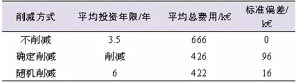 由于規(guī)劃周期較長(zhǎng),考慮了未來(lái)峰荷發(fā)展和DG接入容量的變電站規(guī)劃面臨很大的不確定性和投資風(fēng)險(xiǎn),所以必須進(jìn)行風(fēng)險(xiǎn)評(píng)估。文獻(xiàn)[7]在相同功率約束條件下,對(duì)投資變電站和削減配電側(cè)DG發(fā)電出力兩種技術(shù)方案進(jìn)行了比較,給出了優(yōu)化的折中方法。該文獻(xiàn)以30MW變電站接入不同光伏容量(0、1、9.5MW)的情形為例,對(duì)各種削減模式下延緩?fù)顿Y的效果進(jìn)行了比較,結(jié)果如表2所示,與不削減DG容量相比,采用確定(定時(shí))削減方式,投資年限可延緩3.4年,投資費(fèi)用可減少9.6萬(wàn)歐元;采用隨機(jī)削減方式,投資年限則可延緩2.5年、投資費(fèi)用可減少1.6萬(wàn)歐元。因?yàn)閷?shí)際參數(shù)的隨機(jī)特性會(huì)影響計(jì)算結(jié)果,所以真正的延緩?fù)顿Y效果主要取決于預(yù)測(cè)模型的精度。