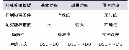 文獻(xiàn)[6]在結(jié)合文獻(xiàn)[5]研究成果的基礎(chǔ)上,描述了如何在規(guī)劃之中考慮不同的動(dòng)態(tài)削減發(fā)電出力方法。不同削減策略的比較如表1所示,文中利用測(cè)量功率和短期預(yù)測(cè)功率來(lái)削減DG發(fā)電出力,證明了在簡(jiǎn)單地削減DG發(fā)電出力的情形下,很容易保證電網(wǎng)運(yùn)行的可靠性,即故障發(fā)生前就可以被修復(fù)。在分布式能源提供更多系統(tǒng)服務(wù)(如電壓平衡、無(wú)功補(bǔ)償?shù)龋┑膹?fù)雜主動(dòng)配電系統(tǒng)區(qū)域內(nèi),則必須采用短期預(yù)測(cè)技術(shù)。
