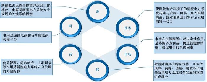 新型電力系統(tǒng)是實(shí)現(xiàn)“雙碳”目標(biāo)、重塑能源安全格局的重要載體,構(gòu)建新型電力系統(tǒng)是提高能源安全韌性的根本性舉措。新型電力系統(tǒng)的安全發(fā)展主要受到源、網(wǎng)、荷、儲(chǔ)、市場(chǎng)、技術(shù)六大因素的綜合影響(見(jiàn)圖1)。