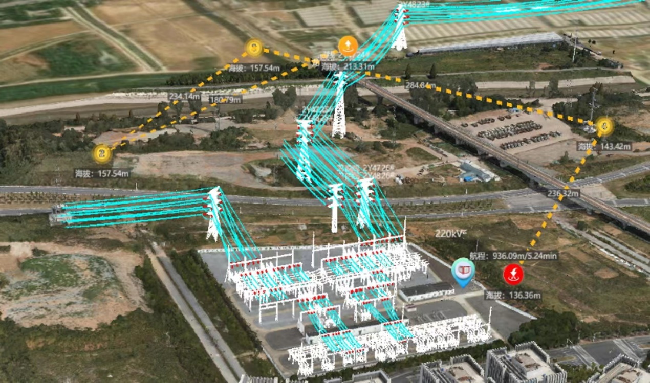 無人機(jī)搭載激光點云吊艙、高清可見光吊艙,從全自動機(jī)場自動起飛,自主飛行,完成地表基礎(chǔ)數(shù)據(jù)自動采集,數(shù)據(jù)實時回傳至云端平臺自動進(jìn)行解算、處理,快速構(gòu)建高精度三維實景模型和三維激光點云模型,通過無人機(jī)自主建模技術(shù)奠定數(shù)字孿生技術(shù)應(yīng)用基礎(chǔ)。