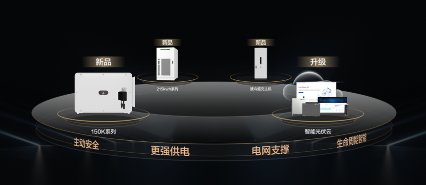 此次重點(diǎn)推出了150K更大功率工商業(yè)逆變器、行業(yè)首款風(fēng)液智冷工商業(yè)儲(chǔ)能、360kW/480kW液冷超充主機(jī)、全新升級(jí)的智能光伏云等。