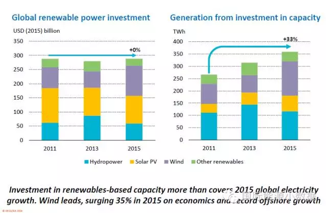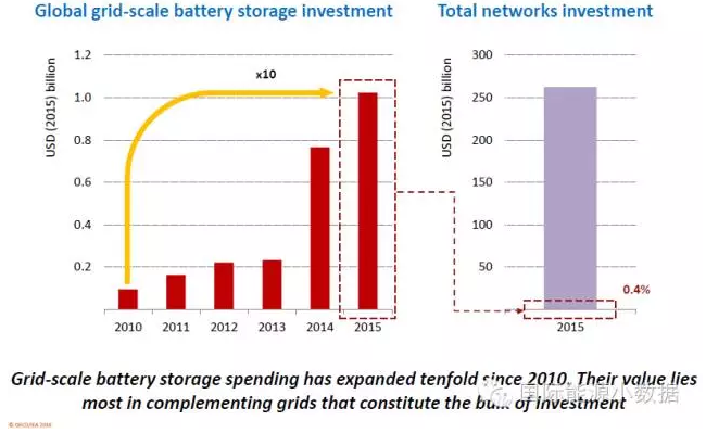 特別值得一提的是,2011年以來全球在可再生能源發(fā)電投資基本平穩(wěn),但是由于可再生能源成本的下降,每年新增的可再生能源發(fā)電量逐年增加,2015年超出2011年33%。此外,電力儲(chǔ)能投資2015年超過100億美元,是2010年的10倍;但是儲(chǔ)能投資僅占電網(wǎng)投資的0.4%,還有很長的路要走。