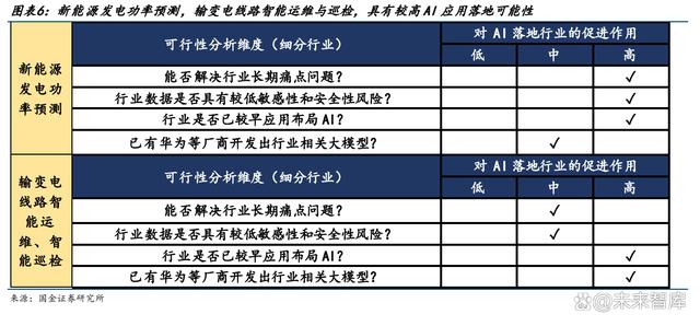 面向行業(yè)主要衡量的維度有: 1) 能否解決長期痛點問題:電網(wǎng)承擔(dān)最主要的功能是維持用電側(cè)與電網(wǎng)側(cè)動態(tài)平衡,而 新能源裝機比例上升無疑加大了電力調(diào)度與消納的難度,因此若 AI 加持能有效解決 消納相關(guān)細(xì)分環(huán)節(jié)的痛點問題,相關(guān)政策導(dǎo)向和資金投入將有望向此環(huán)節(jié)傾斜。 2) 行業(yè)數(shù)據(jù)是否具有較低敏感性和安全性風(fēng)險:大模型需要通過海量數(shù)據(jù)訓(xùn)練,而電網(wǎng) 行業(yè)本身涉及到民生用電與數(shù)據(jù)安全性問題,部分信息不便用于大規(guī)模公開訓(xùn)練,因 此若某一細(xì)分環(huán)節(jié)數(shù)據(jù)敏感性較低或用戶已授權(quán)使用,則大模型將更快接入落地。 3) 行業(yè)是否已較早應(yīng)用布局 AI/技術(shù)實踐:電網(wǎng)多個應(yīng)用場景較早地應(yīng)用了 AI 技術(shù),例 如輸變電線路運維和巡檢方面,2011 年開始,部分企業(yè)就已開展了通過 AI 對電力設(shè) 備外表缺陷進行識別、預(yù)測、跟蹤運行等研究探索。 4) 已有華為等廠商開發(fā)出行業(yè)相關(guān)大模型:例如華為盤古 CV 視覺大模型,已在 L2 級 細(xì)分場景上,推出基于電力大模型的無人機電力巡檢、電力缺陷識別等場景模型。