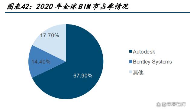 信創(chuàng)發(fā)展背景下,BIM 行業(yè)國產(chǎn)化替代需求強烈。信息技術應用創(chuàng)新為近年以來我國關鍵 命題,旨在通過對 IT 硬件、軟件的重構(gòu),建立我國自主可控的 IT 產(chǎn)業(yè)標準和生態(tài),逐步 實現(xiàn)各環(huán)節(jié)國產(chǎn)替代。國內(nèi)使用的 BIM 平臺主要為國外軟件,而國內(nèi)廠商主要以項目管理 和單點應用類型的產(chǎn)品為主,底層核心技術大多掌握在國外廠商手中。2020 年全球 BIM 行業(yè)市場中,Autodesk 市占率為 67.9%,其次 Bentley Systems 市占率為 14.37%,CR2 集中度較高,顯示出國產(chǎn)替代的必要性和緊迫性。