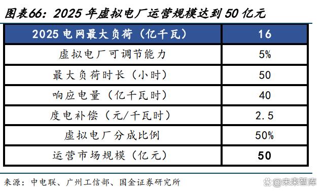 預計 2025 年虛擬電廠投資規(guī)模達到 800 億元,運營市場規(guī)模達到 50 億元。現(xiàn)階段主要 的盈利模式為通過需求側(cè)響應賺取輔助服務費用后的分成。據(jù)中電聯(lián)預計,2025 年我國 全社會用電量將達 9.5 萬億千瓦時,而最大負荷將達到 16 億千瓦,按 5%可調(diào)節(jié)能力、投 資成本 1000 元/千瓦計算,預計到 2025 年,虛擬電廠投資規(guī)模有望達 800 億元。參考目 前峰值負荷時長水平,我們預計 2025 峰值負荷將達到 50 小時,對應 2025 年電網(wǎng)需求側(cè) 響應電量 40 億千瓦時。目前我國虛擬電廠處于發(fā)展初期,度電補償較高以刺激時長,參 考《廣州市虛擬電廠實施細則》0-5 元/千瓦時的削峰響應補貼,預計 2025 年虛擬電廠進 入商業(yè)化運營后,補償標準為 2.5 元/千瓦時。假設分成比例為 50%,則預計 2025 年虛擬 電廠運營市場規(guī)模將達到 50 億元。