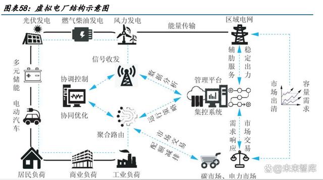 虛擬電廠本質(zhì)上是一套軟件平臺系統(tǒng),核心為“通信”和“聚合”。通過先進信息通信技 術和軟件系統(tǒng),實現(xiàn)分布式電源、儲能系統(tǒng)、可控負荷、電動汽車等分布式能源資源的聚 合和協(xié)調(diào)優(yōu)化,以作為一個特殊電廠參與電力市場和電網(wǎng)運行的電源協(xié)調(diào)管理系統(tǒng),為配 電網(wǎng)和輸電網(wǎng)提供管理和輔助服務。虛擬電廠概念的核心可以總結(jié)為“通信”和“聚合”, 關鍵技術主要包括協(xié)調(diào)控制技術、智能計量技術以及信息通信技術。 虛擬電廠分為兩類:“負荷類”虛擬電廠,和“源網(wǎng)荷儲一體化”虛擬電廠。1)“負荷類” : 聚合了具備調(diào)節(jié)能力的電動汽車、充電樁等市場化用戶,作為一個整體,對外提供負荷側(cè) 靈活性相應調(diào)節(jié)服務。2)“源網(wǎng)荷儲一體化”:聚合新能源發(fā)電、用戶及配儲一系列環(huán)節(jié), 作為獨立市場主體參與電力市場、具備自主調(diào)峰調(diào)節(jié)能力。 具備“源-荷”雙重身份,有效實現(xiàn)削峰填谷。虛擬電廠把各類可調(diào)負荷資源匯聚,根據(jù) 電網(wǎng)削峰填谷的需求,進行線上填報,計劃下發(fā),執(zhí)行反饋,類似于線上工單派單系統(tǒng)。 電網(wǎng)給調(diào)度指令計劃,需求響應調(diào)控計劃,提前幾天/幾周把計劃發(fā)下來。負荷集成商, 虛擬電廠運營商,會把計劃告訴客戶,哪些時段把負荷停掉,把用電負荷降下來,具有源 -荷雙重身份。