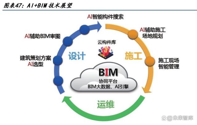 BIM 與人工智能深度融合,有望在設計、施工、運維階段開拓應用場景與解決方案。 設計階段:1)構(gòu)件智能搜索:可以在構(gòu)件智能搜索中使用人工智能對構(gòu)件進行準確 的自動分類,以及使用自然語言理解技術實現(xiàn)構(gòu)件屬性的智能校準;2)AI 輔助布局 規(guī)劃:融入最新的機器學習技術,可以在瀏覽器上生成建筑策劃文件,并輸出建筑空 間的最優(yōu)化布局;3)AI 輔助 BIM 審圖:AI 技術可以輔助 BIM 對大量規(guī)范、圖集、標 準以及模型、圖紙的匹配性學習,做好設計合規(guī)性、合理性的把控。施工階段:進行輔助施工場地規(guī)劃,AI 可以通過場地智能布置和合規(guī)合理性校驗來 幫助經(jīng)驗不足的技術人員增質(zhì)提效,通過建模對施工現(xiàn)場不同階段的復雜狀態(tài)進行模 擬展示,通過數(shù)據(jù)分析及時反饋前期方案的合理性,同時反向指導施工組織設計,進 行資源配置優(yōu)化。 運維階段:進行運維智能管理,AI 可以通過機器人和無人機等的應用,使用大量實 際現(xiàn)場視頻數(shù)據(jù)進行訓練,對現(xiàn)場數(shù)據(jù)進行分類處理和智能管理,大幅提升施工效率 和安全質(zhì)量水準。