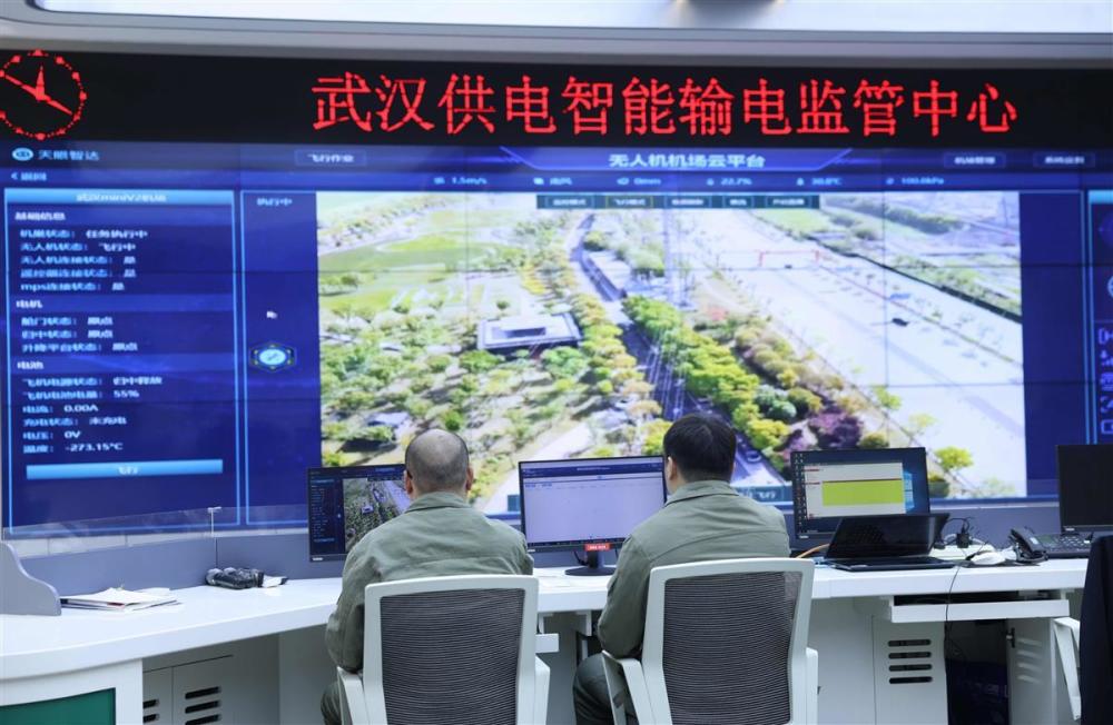 10月23日,武漢漢口江灘,一架白色的無人機在高空穿梭,機頭對準(zhǔn)濱江區(qū)內(nèi)的國家電網(wǎng)線路來回進(jìn)行掃描、拍攝。與此同時,距離巡檢現(xiàn)場數(shù)公里外的國網(wǎng)武漢供電公司的巨型屏幕上,無人機的超高清畫面即時顯示。