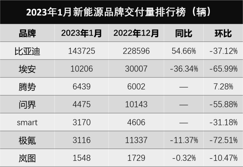 2023年的第一個月份,各家新能源車企也是準時公布了銷量成績,說實話,基本都不怎么好看,受春節(jié)假期的影響,大部分車型都出現(xiàn)了“腰斬”的現(xiàn)象。