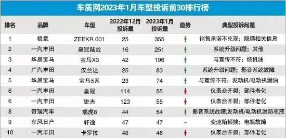 但另一方面,根據(jù)車質(zhì)網(wǎng)公布的2023年1月車型投訴排行榜,極氪001在1月份以355單的投訴量“榮登榜首”,登榜原因主要集中在銷售欺詐、承諾不兌現(xiàn)以及新車座椅鼓包等問題,極氪如果想要在汽車市場上走得更遠,這個售前售后的問題及時給消費者解決。