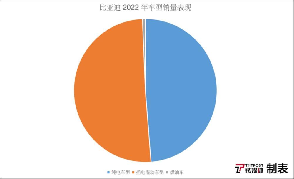 數(shù)據(jù)顯示,比亞迪 2022 年全年累計(jì)銷量達(dá)到了 186.9 萬(wàn)輛,其中來自純電車型和插電混動(dòng)車型銷量分別為 91.1 萬(wàn)輛、94.6 萬(wàn)輛,燃油車銷量?jī)H有 1.2 萬(wàn)輛。