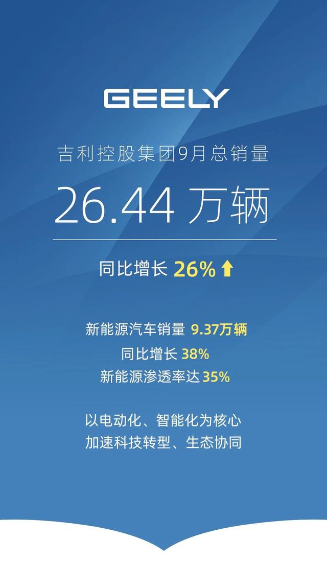 從吉利控股集團(tuán)官方公告獲悉,吉利控股集團(tuán) 9 月汽車總銷量 26.44 萬(wàn)輛,同比增長(zhǎng) 26%。新能源汽車銷量 9.37 萬(wàn)輛,同比增長(zhǎng) 38%,新能源滲透率為 35%。