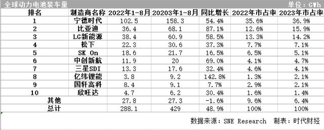 根據(jù)市場(chǎng)研究機(jī)構(gòu)SNE Research公布的全球動(dòng)力電池裝車(chē)數(shù)據(jù)。2023年1—8月,全球動(dòng)力電池裝車(chē)量為429GWH,同比增長(zhǎng)48.9%。中國(guó)六家電池企業(yè)入名前十,整體市占率63.1%,較去年同期的58.1%增加5個(gè)百分點(diǎn)。