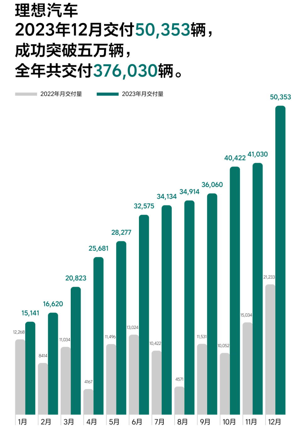 作為新勢力的代表,理想汽車今年表現(xiàn)也同樣亮眼。其公布的數(shù)據(jù)顯示,2023年12月,理想汽車交付新車5.04萬輛,同比增長137.1%。這也是理想汽車首次月交付超過5萬大關(guān),兌現(xiàn)了CEO李想此前的承諾。整體來看,理想在2023年累計(jì)交付37.6萬輛,同比增長182.2%。截至2023年12月31日,理想汽車?yán)塾?jì)交付量超60萬輛,是交付量最高的新勢力車企。
