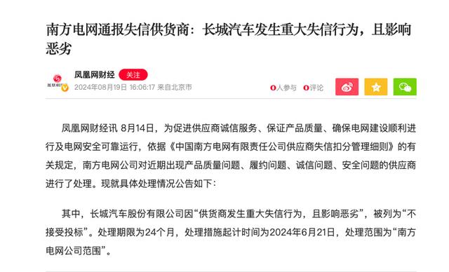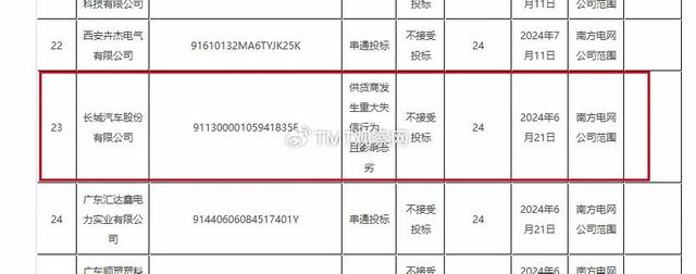 其中,長(zhǎng)城汽車股份有限公司因“供貨商發(fā)生重大失信行為,且影響惡劣”,被列為“不接受投標(biāo)”。處理期限為24個(gè)月,處理措施起計(jì)時(shí)間為2024年6月21日,處理范圍為“南方電網(wǎng)公司范圍”。