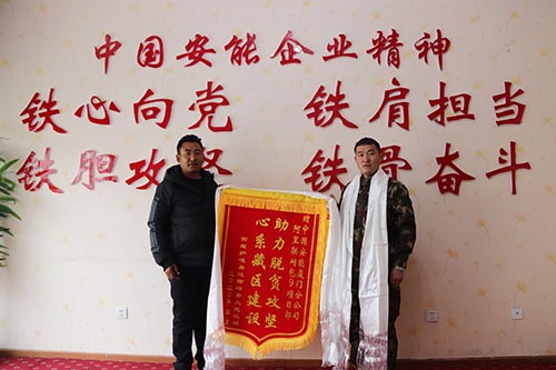 中國電力網(wǎng)訊 4月20日上午,西藏日喀則市薩嘎縣達吉嶺鄉(xiāng)派出所所長旦增扎巴專程來到中國安能第二工程局阿里聯(lián)網(wǎng)線路包9項目部,為全體人員獻上潔白的哈達,為項目贈送了印有“心系藏區(qū)建設,助力脫貧攻堅”內容的錦旗和感謝信,對項目積極承擔央企社會責任、助力脫貧攻堅的作為表示贊賞與感謝。“中國安能為我們幫了大忙,建設阿里聯(lián)網(wǎng)工程為我們送電,為我們解決務工難題,還支持我們建設,我受我們鄉(xiāng)書記委托,專程過來感謝你們,我們達吉嶺鄉(xiāng)全鄉(xiāng)人民都感謝你們!” 他緊握項目經(jīng)理何樂峰的雙手,動情地說道。