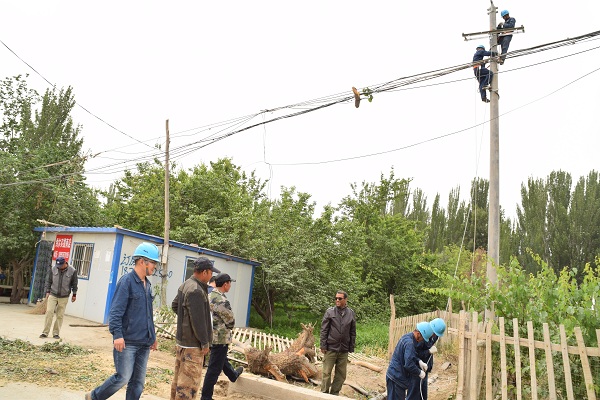 2019年8月15日傍晚,阿克蘇片區(qū)的上空陰暗無比,霎時間狂風(fēng)四起,卷積著烏云籠罩了整座城市。瞬時風(fēng)力達到9級以上,電力線路迎來了一次巨大的考驗,惡劣天氣導(dǎo)致沙井子片區(qū)多條路故障停電。陳亮接到指令,立即啟動應(yīng)急搶修預(yù)案,連夜頂著狂風(fēng)暴雨奔赴一線,一切為的只有兩個字:搶修!經(jīng)過長達15個小時晝夜不歇的高強度連續(xù)作業(yè),沙井子片區(qū)所有故障線路全部恢復(fù)供電!然而在這背后,是陳亮帶領(lǐng)工人們15個小時的奮戰(zhàn)!