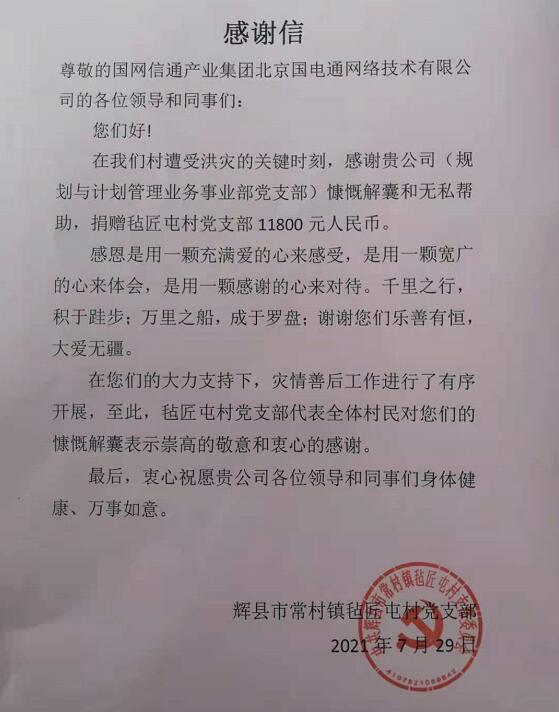 中國電力網(wǎng)訊 (通訊員 朱友宇) “在您們的大力支持下,災情善后工作進行了有序開展,至此,氈匠屯村黨支部代表全體村民對您們的慷慨解囊表示崇高的敬意和衷心的感謝”,輝縣市常村鎮(zhèn)氈匠屯村黨支部在感謝信中寫道。7月29日,國網(wǎng)信通產(chǎn)業(yè)集團國電通規(guī)劃與計劃管理業(yè)務事業(yè)部黨支部收到了一封特殊的感謝信,這封信不是來自用戶的,也不是來自上級單位的,它來自輝縣市常村鎮(zhèn)氈匠屯村黨支部。