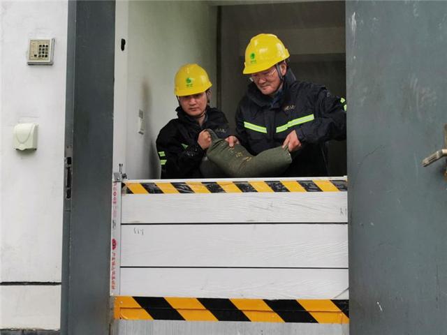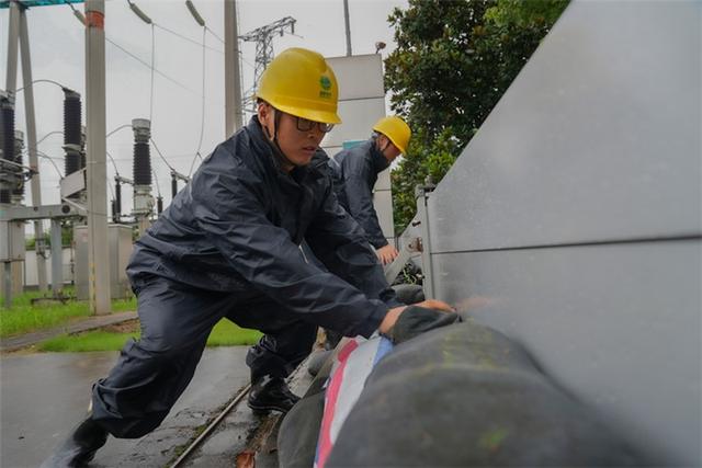 國網(wǎng)安徽安慶岳西縣供電公司員工裝沙袋加固城西變電站圍墻,防范臺風影響變電站設備安全運行。